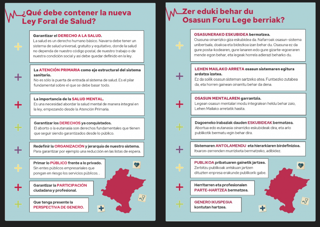 En el acto se han presentado una serie de puntos que se consideran de vital importancia para tener “la ley que demanda nuestra sociedad”. Garantizar el derecho a la salud como derecho humano fundamental, trabajar la Atención Primaria como eje estructural del sistema sanitario, garantizar la participación activa de pacientes y profesionales, o blindar algunos de los derechos ya conquistados, como la interrupción voluntaria del embarazo o el derecho a una muerte digna, son algunos de los temas que se han tratado.